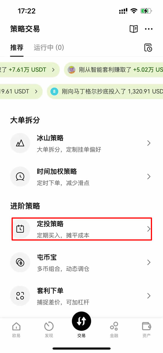 经常使用欧币平台的朋友们相信也会经常去寻找一些低风险的理财产品,其实欧币平台的软件内部就为大家推荐了不少的低风险产品,今天就为大家介绍一下定投策略这个优质产品是如何操作的