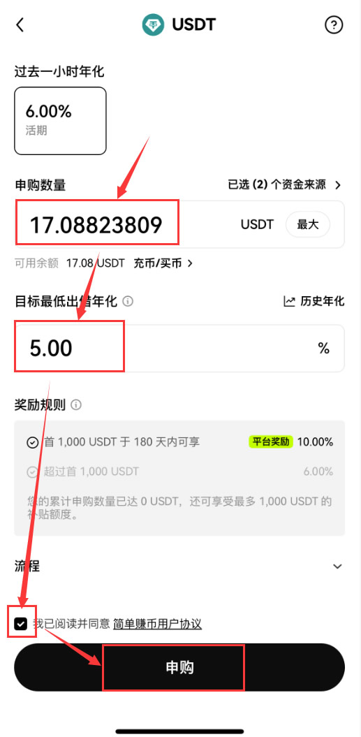 点击你喜欢的币种后查看详细信息,输入数量后点击申购
