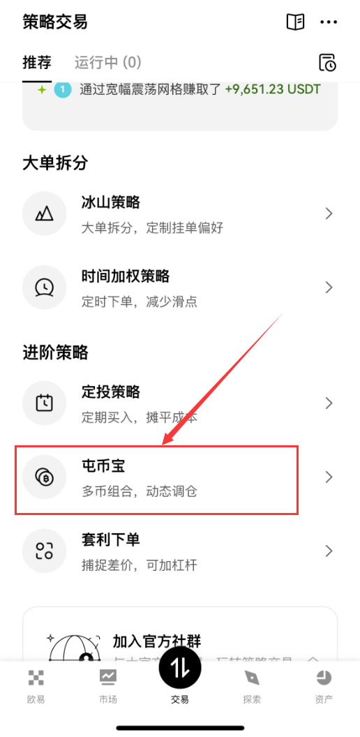 首先打开官方平台点击下方交易按钮,在呼出菜单中点击策略交易,找到屯币宝
