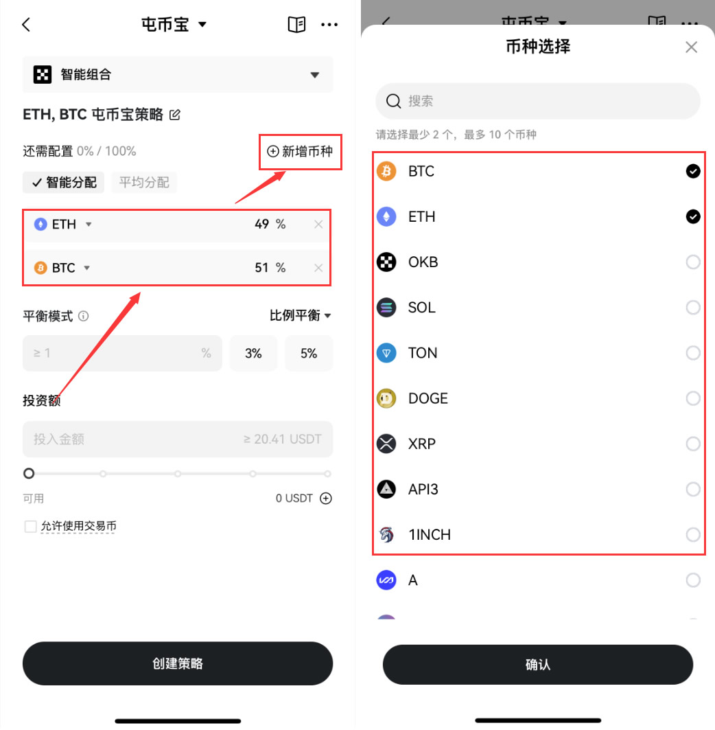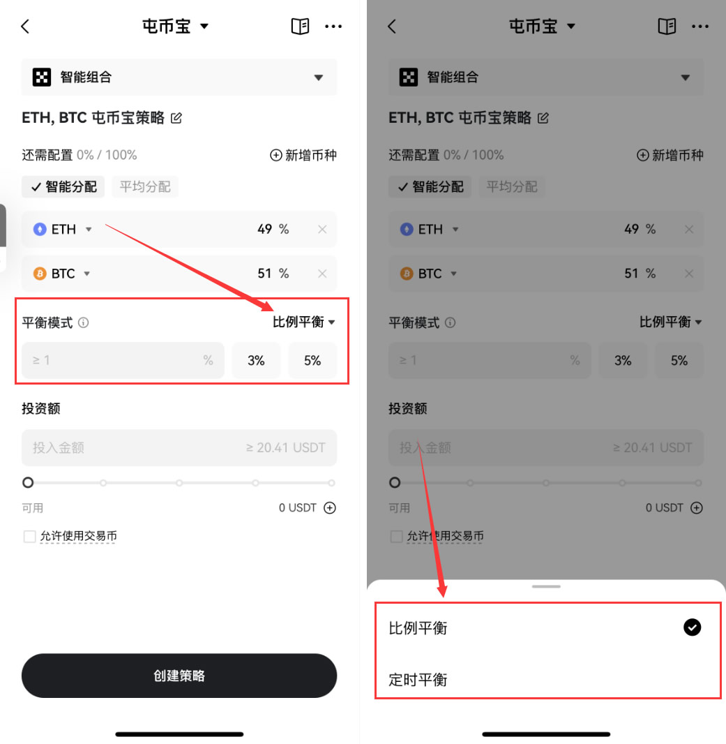 设置不同币种之间的比例,选择平衡方式