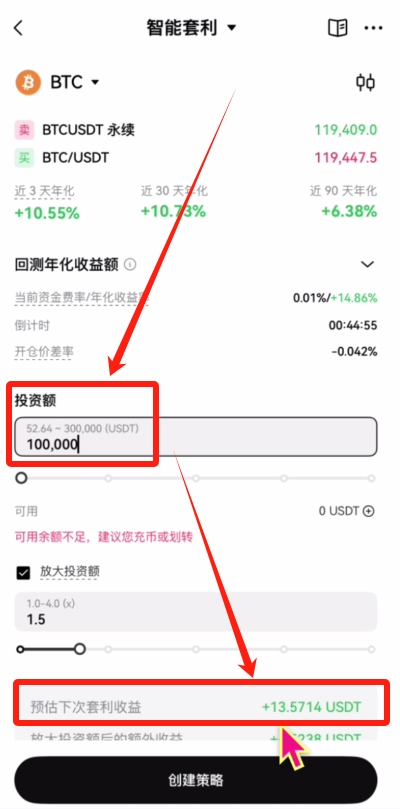 如果我们选择放大投资额的话,一天最多可以加108个usdt,但是这属于是一种上杠杆的行为了,大家自行选择,完成后点击创建策略就万事大吉了