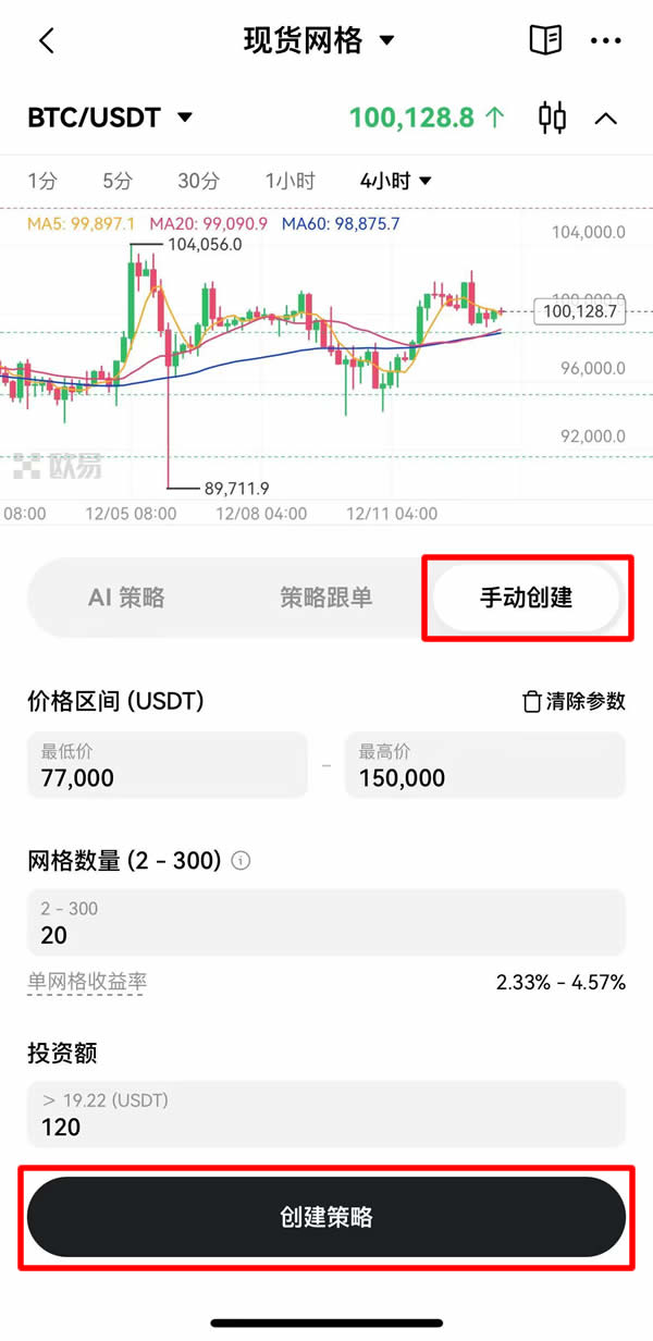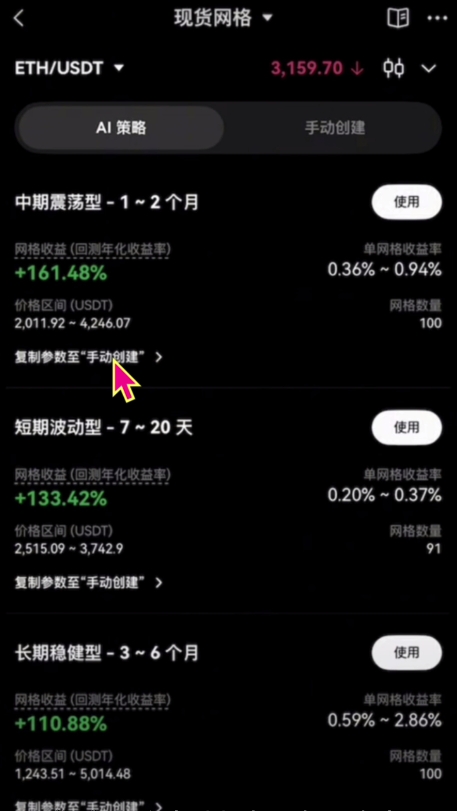 最后,选择你喜欢的网格模式,输入数值参数之后,就可以创建策略了
