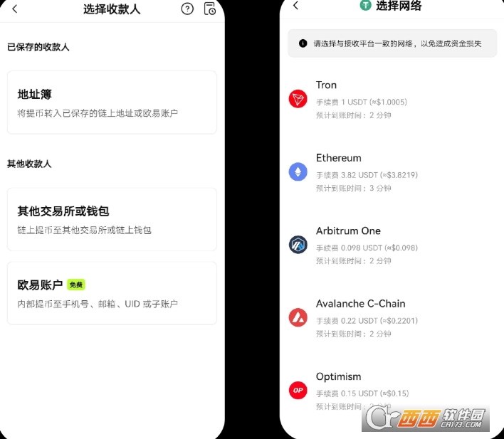 ·提币时,选择和汇入方地址一致的链或网络。请务必确认充提币地址、网络、数量等信息是否正确,避免此类问题再次发生。例如您从A交易所/钱包提币到B交易所/钱包,在A交易所/钱包选择Tron链,在B交易所/钱包选择Ethereum的链,那么您的币是无法到账的。
