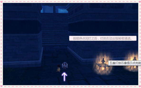 五盏灯按石像提示点完就OK,然后就会开门可以继续做主线啦!