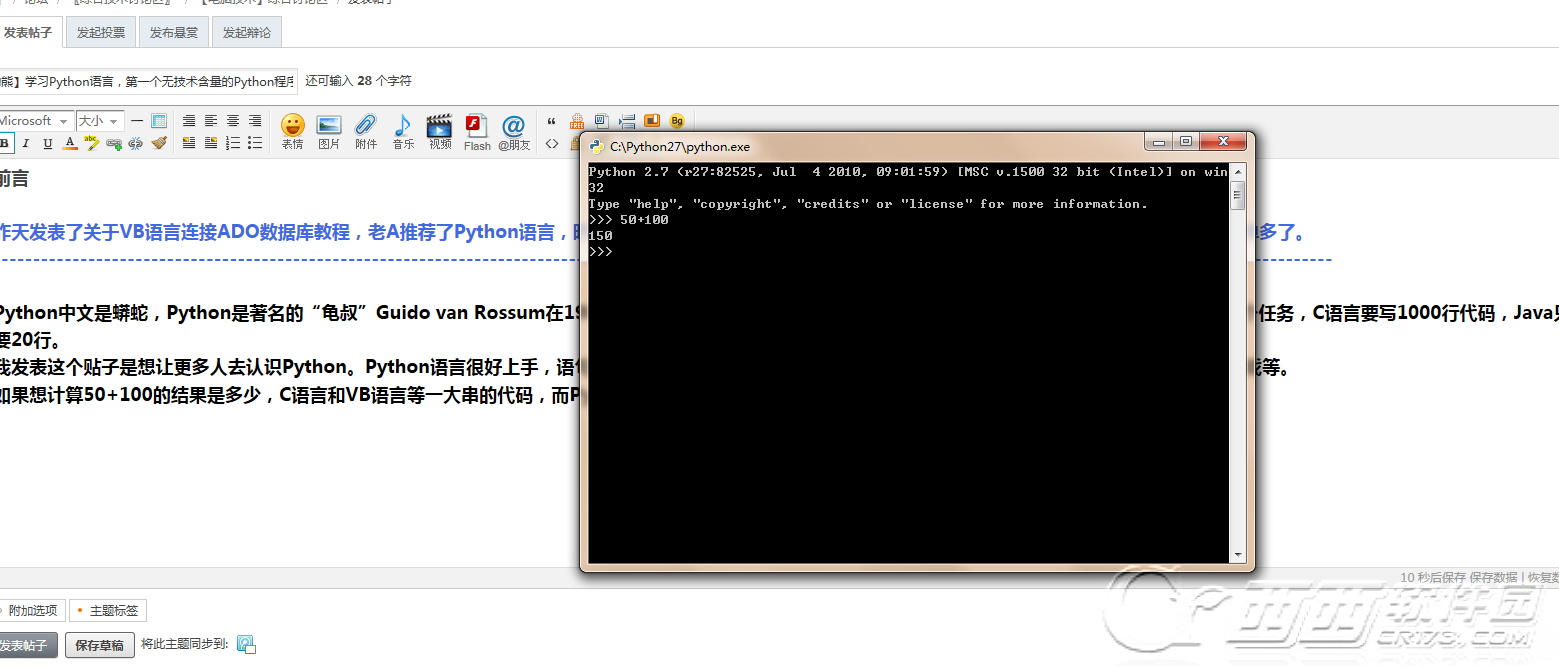 如果想计算50+100的结果是多少,C语言和VB语言等一大串的代码,而Python计算50+100的代码只需要这样“50+100”