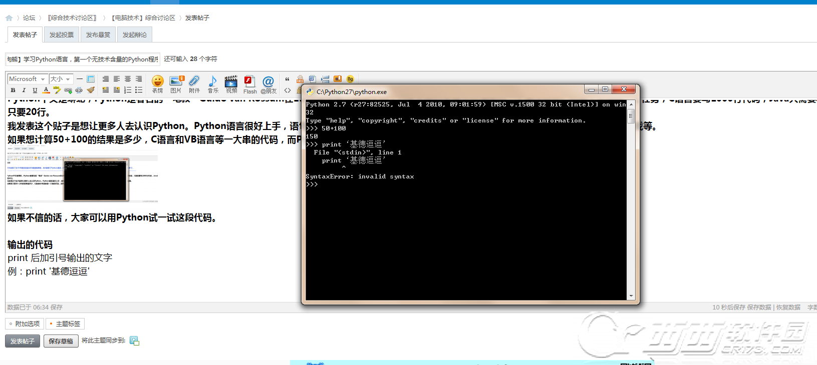 我发表这个贴子是想让更多人去认识Python。Python语言很好上手,语句简单明了,不像C++ . VB等语言复杂。Python语言涉及到很多方面,比如3D游戏等。