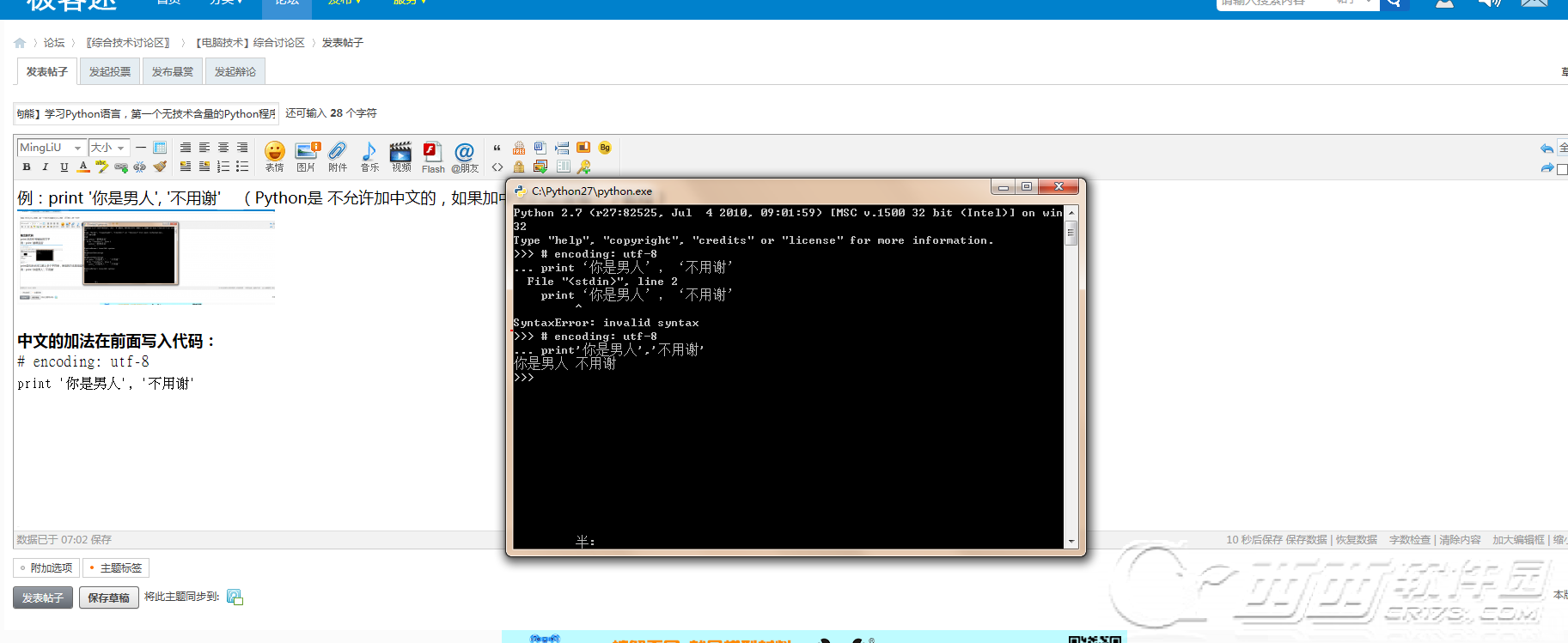 例:print '你是男人', '不用谢' (Python是 不允许加中文的,如果加中文的话请看一下教程)
