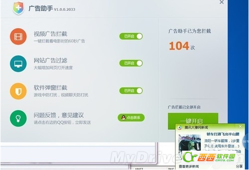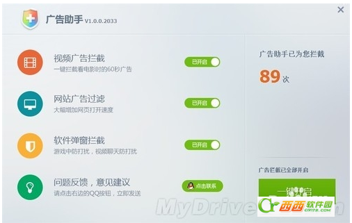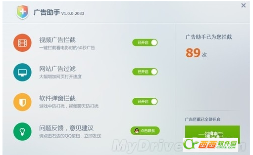 2.这款软件采用了扁平化风格,界面比较清爽。作为主打功能也是唯一功能,这款软件提供“视频广告拦截”“网站广告拦截”以及“软件弹窗拦截”三大功能,可以独立开启,也可以一键开启。