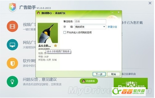 3.值得一提的是,这款软件的主界面没有任何“选项”设置,只有一个联系QQ。点击QQ图像会提示加好友,对方的昵称就叫“去60秒视频广告助手。