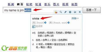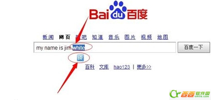 第二步:然后我们打开百度输入一句英语my name is jim white 我们把一个单词选中,然后就会看到一个译字,我们点击译字。