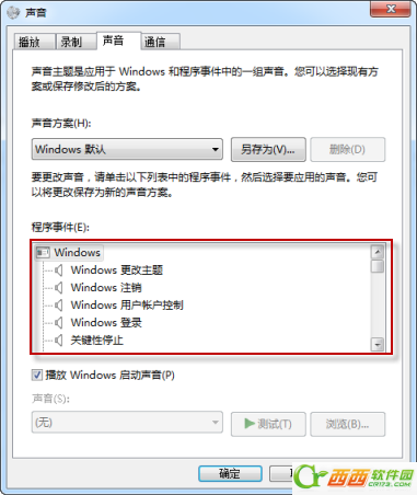 3、接着在弹出来的声音界面中,切换到“声音”选项卡下,我们可以看到下方的程序时间中有一系列的声音,大家可以随意点击一个测试一下这个系统声音,然后选择自己喜欢的,如果想要自定义自己喜欢的声音的话,可以直接点击“浏览”按钮然后选择自己想要添加的声音即可。PS:windows设定的声音要求文件都是wav格式的,如果需要自行下载声音的话,要注意格式问题哦。