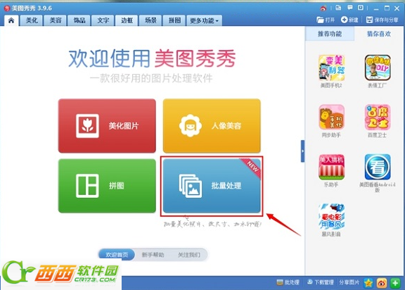 二、打开美图秀秀软件,点击“批量处理”,如下图所示: