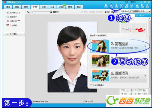 1.用“美图秀秀”打开一张图片,单击右上角的“抠图”并选择“自动抠图”功能,如图2所示。