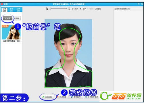 2.软件会自动进入“自动抠图”界面,选择“抠前景”笔在需要的人物画面上涂抹即可(如果发生错误可以用“删背景”笔涂抹错误部分即可)。完成后单击“完成抠图”,如图3所示。