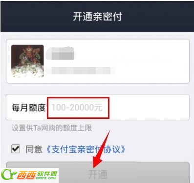 4、输入每个月支付的额度,最少是一百块,最大是两万块。像我这种工薪阶层的能给TA一千块在网上花不错了。最后点击开通