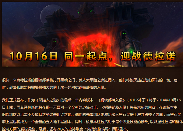 《魔兽世界》国服今天正式宣布,《钢铁部落入侵》(也就是6.0.2补丁)将在中国时间10月16日上线,这也令该补丁的上线实现了全球同步。