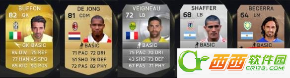 从左至右分别为传奇卡(XBOX平台独享)、年度蓝卡(入选年度最佳阵容TOTY的球员)、赛季蓝卡(入选了赛季最佳阵容TOTS的球员) 黑卡(入选周最佳阵容的球员)、橙卡(当选杯赛最佳球员)