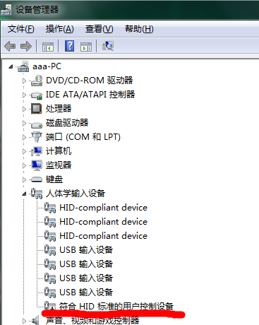 第三步:点击人体学输入设备前面的小三角,里面找符合HID标准的用户控制设备,右键禁用。