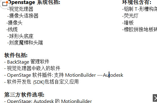 ackStage管理软件、视觉处理器中嵌入的软件、OpenStage软件插件,支持MotionBuilder,Autodesk、软件开发包 (SDK)包括自定义应用。第三方软件选项有MotionBuilder。