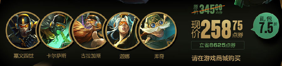 fnatic系列皮肤分为嘉文四世、死亡颂唱者、库奇、迦娜以及古拉加斯,单个售价6900点卷,整套目前7.5折优惠25800点券。