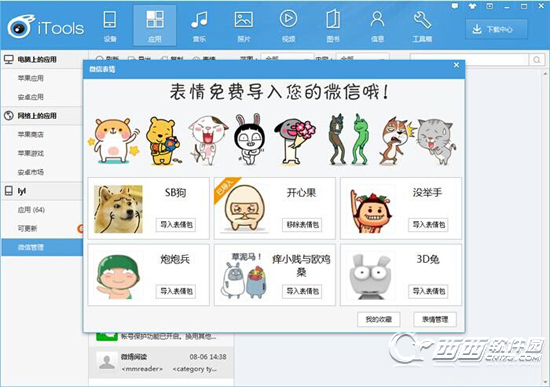 西西和小伙伴们聊天的时候,往往要用到各式各样的表情来表达自己的情绪和个性。看到其他童鞋的漂亮搞笑的表情是层出不穷,羡慕不已,网络暴漫表情等也是以此方式而走红。而进入微信时代时,社交表情却进入低谷期。一是因为微信自带的高质量表情比较有限,而一般好看的微信表情又需要收费;其次,自己手动添加表情对于大多数普通手机用户而言,还属于较难操作的技术流,因此原创的表情也所见寥寥。近日,全球最快捷、最好用的iOS管理软件iTools全新升级iTools3.0,创新地加入微信表情导入功能,充分满足用户在微信时代的社交表情需求。