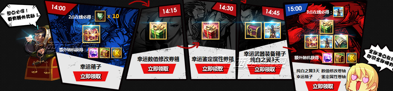 2、1月17日14点整和15点整,除了获得固定奖励外,每个玩家还可额外获得一个幸运宝箱,开启幸运宝箱将额外获得以下道具之一:绑定点券1000、活动时装交换券、[传说&稀有]首饰珍藏箱、+9强化石、鉴定属性修改券x35、鉴定数值修改券x35;