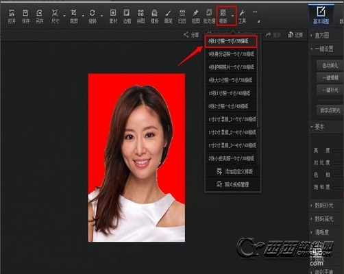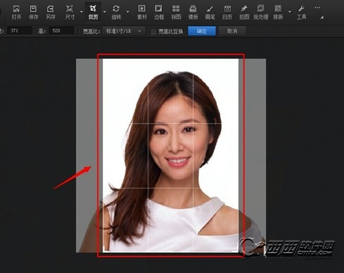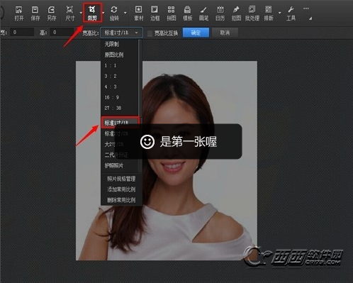 4、根据需求剪裁成一寸照片:点击菜单栏--“剪裁下拉菜单”--“按一寸/1R照片比例剪裁”然后点击“剪裁”ps:根据你自己需要的大小来剪裁