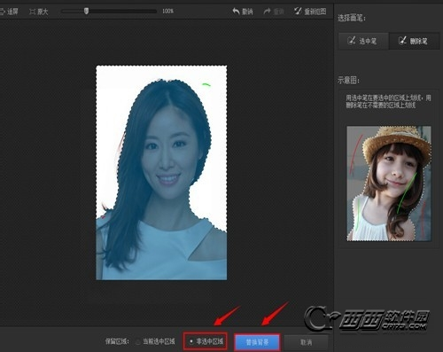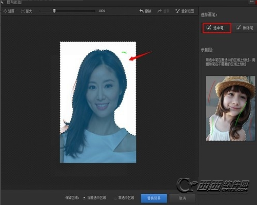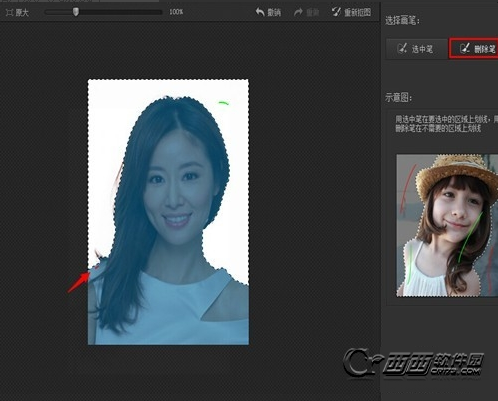3、在自动抠图界面,用“选中笔”涂画你要去掉或保留的一边。如笔者所选的这张图,因为白色区域比较明显,只需画一笔即可去掉大部分自己不想要的,网友可根据自己照片的实际情况来涂画。