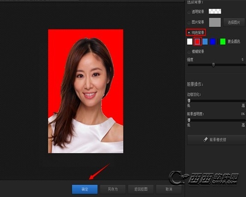 6、进入“替换背景”对话框,在纯色背景选择颜色。笔者选择红色,然后确定。在此提醒一下,如果发现边缘有比较明显的白色线条,可通过“边缘羽化”来模糊,或者直接选择“前景橡皮擦”来恢复前景(大家可亲自体验一下)。