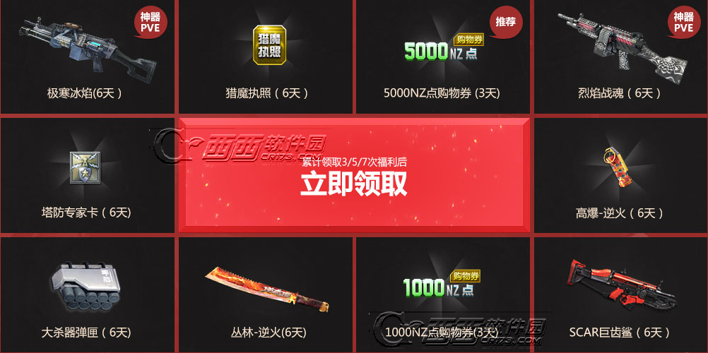 活动时间内,每天登录游戏后即可以任意领取一种道具,但每种道具每一期只能领取1次。