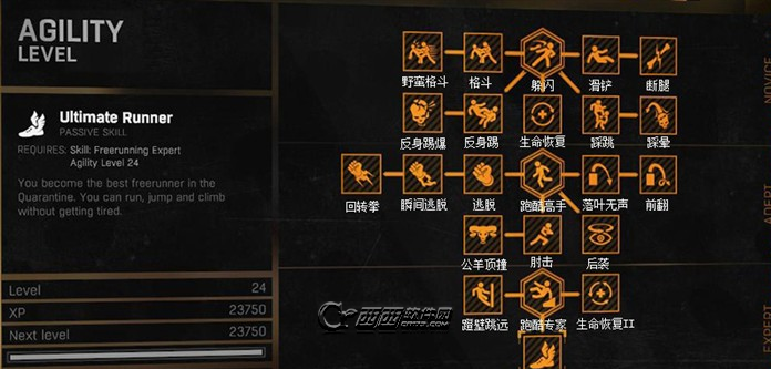 20、跑酷专家(Freerunning Expert):被动技能。成为一名跑酷专家,奔跑得更远,攀爬得更快,并得到极限奔跑能力。