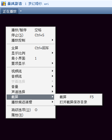 2、在暴风影音播放器上的“正在播放”位置,右键,弹出右键菜单,点击截屏,弹出下拉菜单。