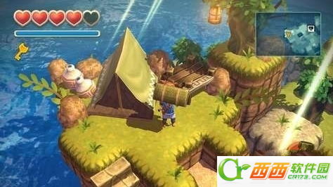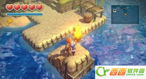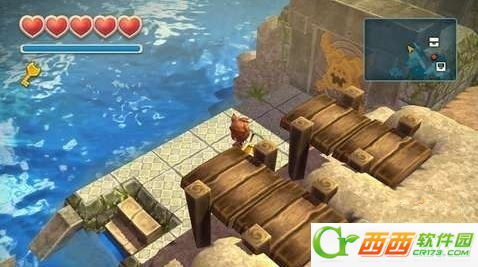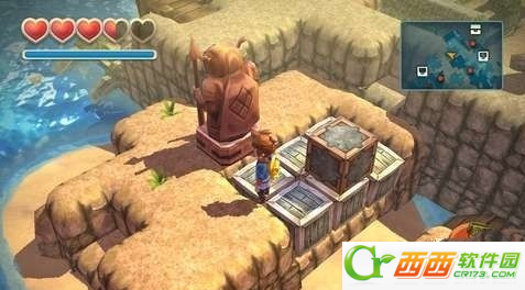 接下来来到大潮礁,这里的目的是拿到珊瑚军刀,这个关卡比较小,但是有一个比较难的谜题,先把箱子推成这样,然后用炸弹把下面的一层木箱子炸掉,最后把剩下的推下去铺路,然后把石像推过去,让两个石像面对面,机关就打开了。