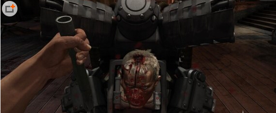 当我们将3个护甲打掉之后,敌人的电源再也不会亮了,这时我们可以攻击敌人的身体,当这次敌人倒下之后,我们取下了敌人的面具,原来这就是一直追捕我们的哪位德军高层,不过这次他再也站不起来了。