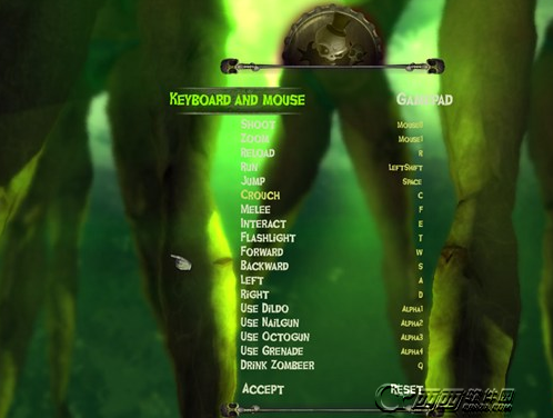 可以看出游戏的操作还是很简单的,动作射击游戏常用的那些按键都可以用到。需要注意的是角色需要喝啤酒来保持人形状态,不喝就会逐渐僵尸化,喝得太多也会醉死,所以需要保持一个平衡。因此我们需要在地图中不断收集黄绿色的啤酒瓶,靠近按E即可,但是有携带上限,注意哦。当发现你下面的状态条偏于左的时候,你就越来越趋于僵尸化了,这时候就要喝啤酒了。