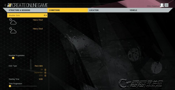 设置天气,可以对天气进行选择,可以选择一套两式的天气变法,先选择前者天气,再选择后者天气,那么在比赛过半之后就会由前者天气进入到后者天气之中,因此比赛的天气会发生一次变化。