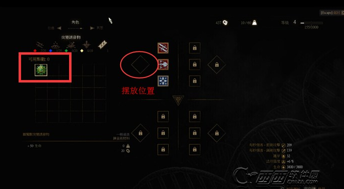 这个技能也是和一般的技能一样需要在玩家能力面板中添加此才可以增加当前角色效果,且和普通的技能摆放位置也不一样,随着等级提升,到28级最多可以添加4个突变诱发物技能。如下图所示。