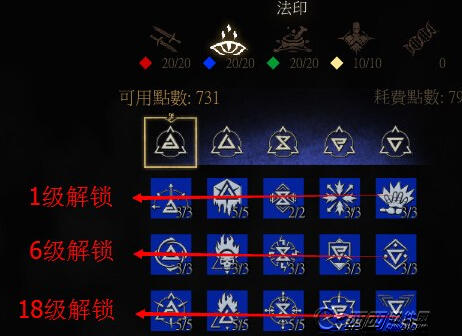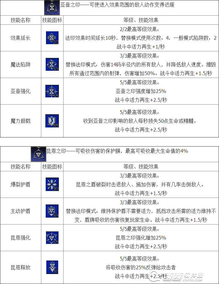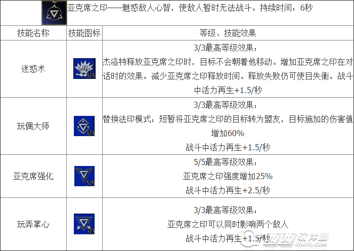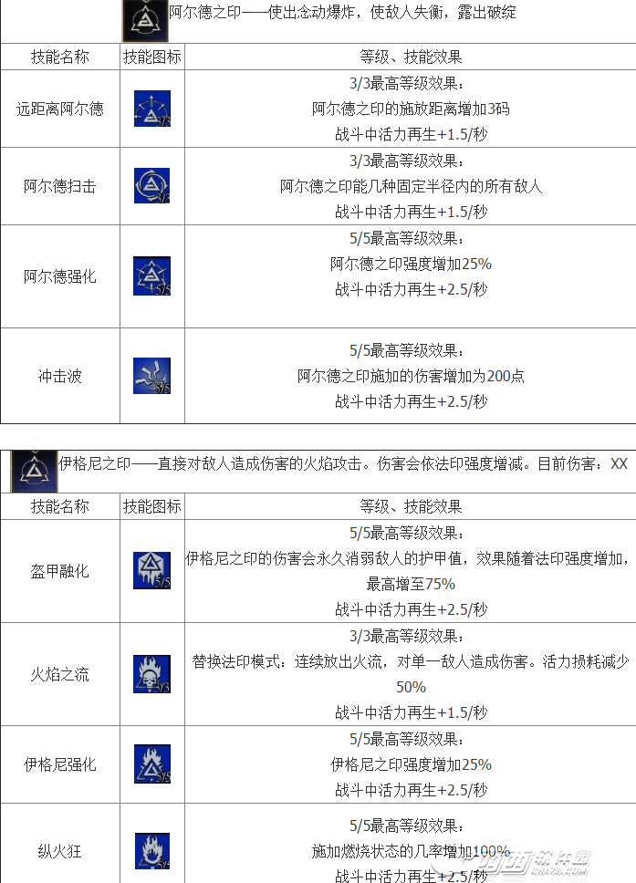 在法印技能中和战斗技能是一样的,总共会有5大技能,其中包括4个树状形式的分支技能,并且分支技能同时可以升到2~5级不等,每个级别增益效果也不同,下面就放出法印的每一个分支技能属性效果清单