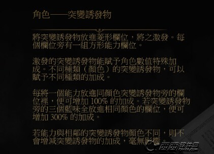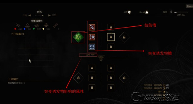 我们打开能力值栏目就可以看到,一共有12普通技能栏加上4个突变诱发物能力槽,随着等级的上升,到达30级之后就可以全解锁了。我们可以看到在能力栏的突变诱发物栏装备上之后会也会影响到当一组(一共4组,每组4个技能包括突变诱发物)的附加属性,而增益属性的量也是根据当前普通技能颜色来增加的,也就是每将一个能力放进同颜色的突变诱发物栏位里,便可增加100%的加成,若3个颜色相同则是增加300%。当然如果当前没有与诱发物相同颜色的技能,则是没有加成(只加上本身突变诱发物的增益属性),如上图所示就是没有加成的状态。