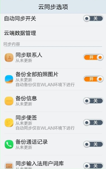 【云端数据管理】是设置同步的内容,包括有联系人同步、拍照图片备份、信息备份、便签同步、通话记录备份、输入词库同步备份、备份系统配置选项。