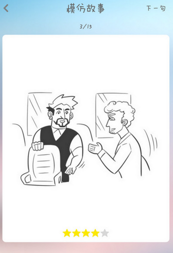 录音结束后系统会对比录音与原音,对用户跟读录音进行评分,五星为满分。用户可点击右边绿色按钮听自己的录音。如果对跟读效果不满意的,可以点击重读重来一次。