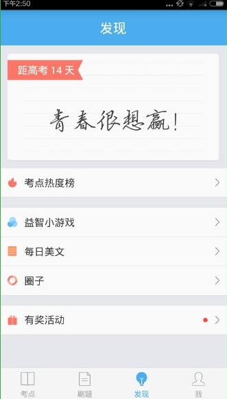 3、在发现界面,有着考点热度榜,益智小游戏和每日美文的哟~