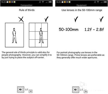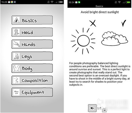 此外,软件还为用户提供了一些拍照的技巧与方法,让你瞬间拥有摄影师拍照的感觉。首先该软件为用户提供了拍照时最基本的常识性知识,如方向、光照、背景选择等。