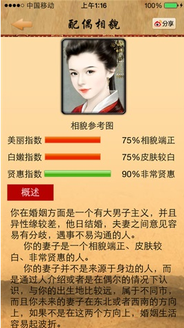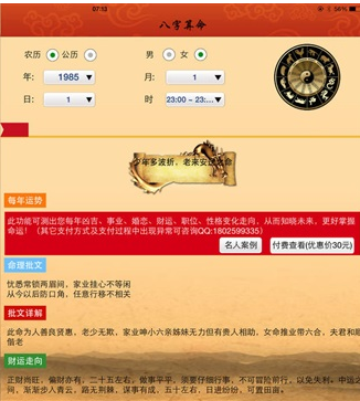 1、八字算命:该功能将详细揭晓您一生的秘密,从家庭婚姻,到学业事业,八字算命都可以详尽为您解答。