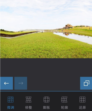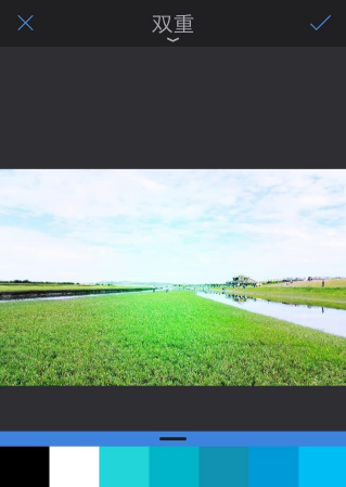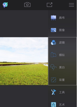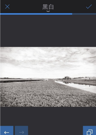 滤镜选项中包含着 模拟(即模拟胶片的滤镜效果)、黑白、双重三个子选项。模拟工具如下(图二)所示,你可以根据自己的需求来实现很多效果。使用时,只需点击你要调节的工具,等待变为 高亮蓝色时,在图像上左右滑动即可改变其效果强度,非常精确易用。