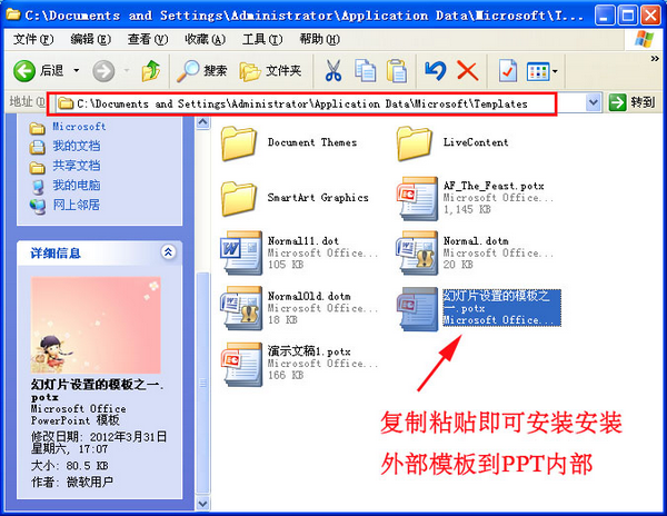将外部模板安装为powerpoint内部模板:模板是以文件的形式存放的。因此,如果从网上或光盘上找到一些ppt模板,只要把它们复制粘贴到C:\Documents and Settings\Administrator\ApplicationData\Microsoft\Data\Microsoft\Templates文件夹下,不过需注意Office 2007/2010能够识别*.pot和*.potx两种格式的模板。
