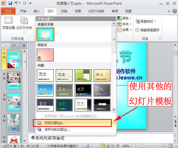 先打开自己希望更改模板的演示文稿,然后选择“设计”→“主题”,点击下拉箭头,单击“浏览主题”。然后就可以在弹出的“选择主题或主题文档”对话框中选择想要借用的模板文件potx或者是pptx、pps文件,甚至可以选择一个Web页文件来作为模板。