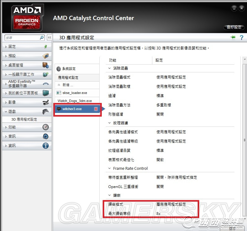 开启AMD显卡控制中心=>3D应用程序设定=>帮巫师3建立一个档案=>修改我红色圈选地方