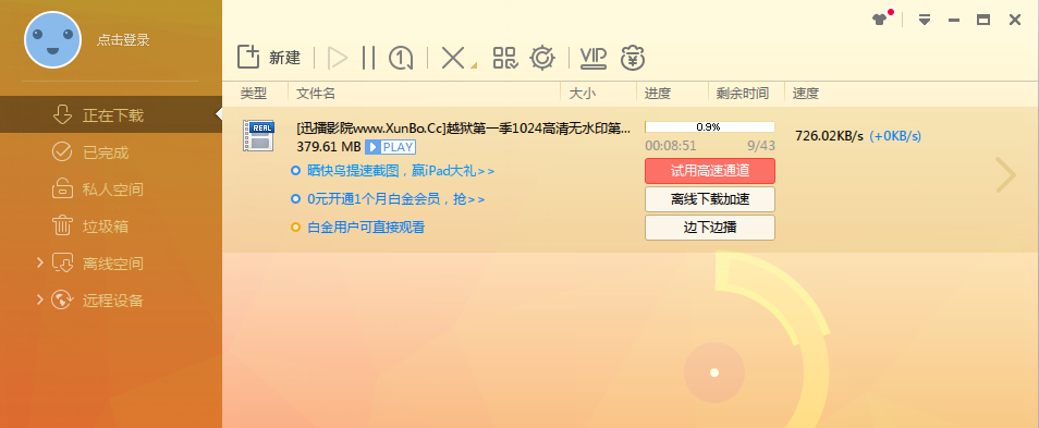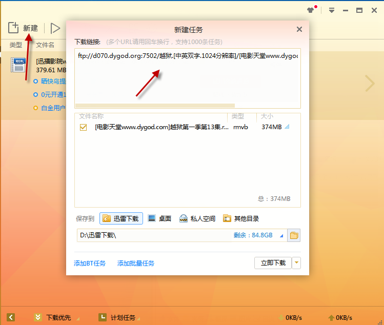 最后打开你电脑上的下载工具。比如迅雷,QQ旋风、快车等等,我打开我电脑上的迅雷,如下图,单击“新建”按钮,会弹出新建下载任务对话框,将刚才复制的种子地址粘贴