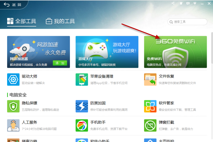 2、点击右下角的更多,在全部工具中可以看到360免费wifi功能